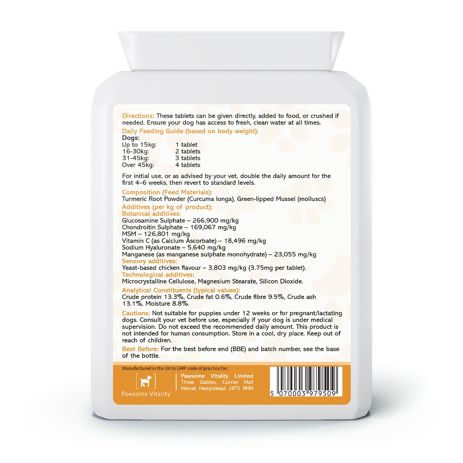 Pawsome Vitality Joint Support is a premium complementary feed designed to help maintain joint health and mobility in adult dogs of all ages and breeds.Each tablet delivers a high-strength, veterinary-strength blend of proven joint-supporting nutrients:Glucosamine Sulphate .com 266,900 mg/kg